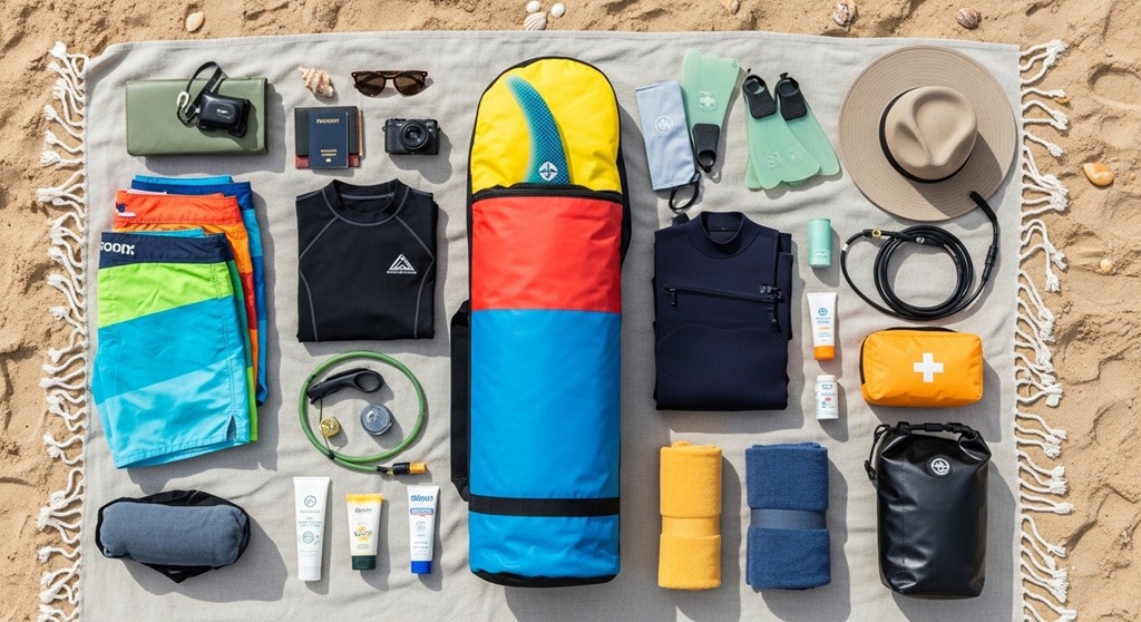 Essential accessories include padded surfboard bags, fin cases, leash organizers, rail protection, wax containers, and repair kits.