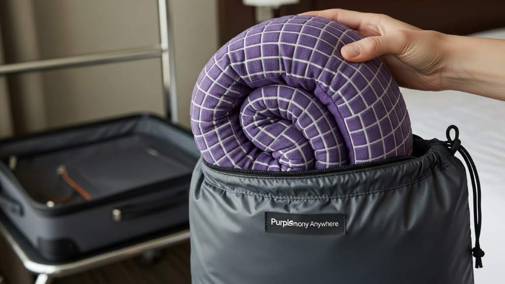Compact rolled Purple Harmony Anywhere pillow packed in travel bag for portability